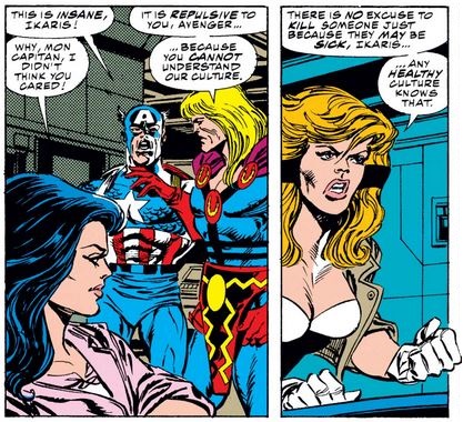 And what do Eternals do when one of their own goes mad? Why, they kill them, of course (!!!). This arouses a predictable response from Captain America (Sersi’s sarcastic response notwithstanding), to which Crystal provides helpful context.