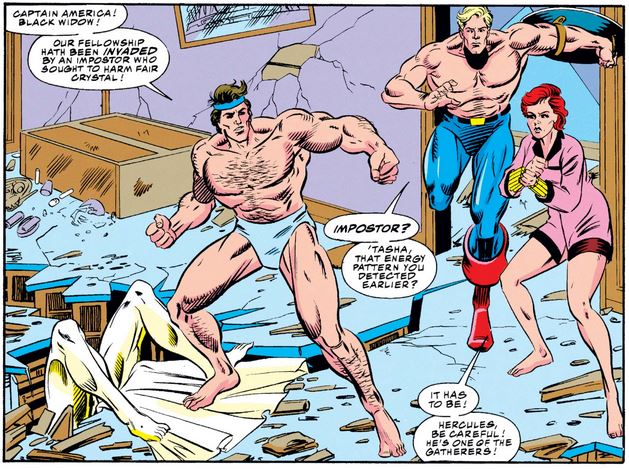 Issue #362, with its starkly different art style, focuses on the imposter Vision, who seems to kill his fellow Gatherer the Swordsman before creeping up on a sleeping Crystal. After she awakens and attacks him, Hercules joins in, followed by Cap and Natasha (all in sleepwear, kind of).