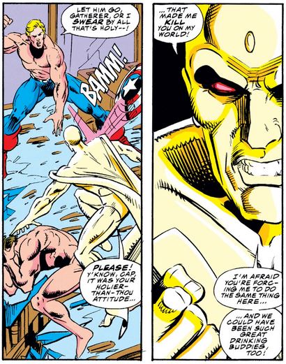 This leads eventually to a vertical double-page spread—another increasingly frequent occurrence in the 90s—that welcomes three of Sersi’s fellow Eternals: Ikaris, Sprite, and Arex (making his first appearance here).