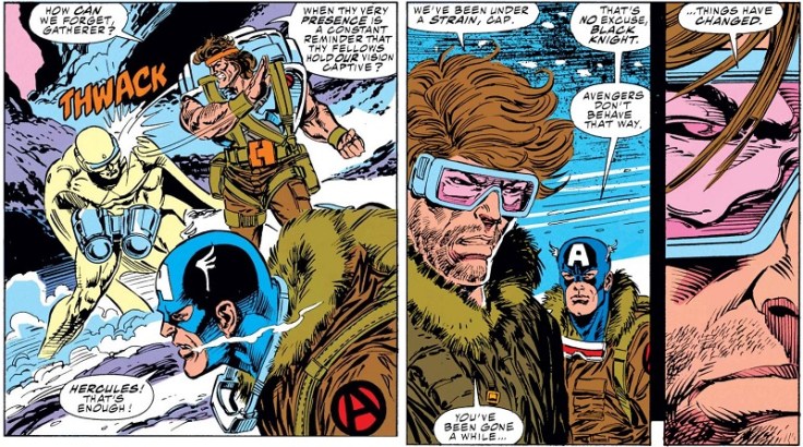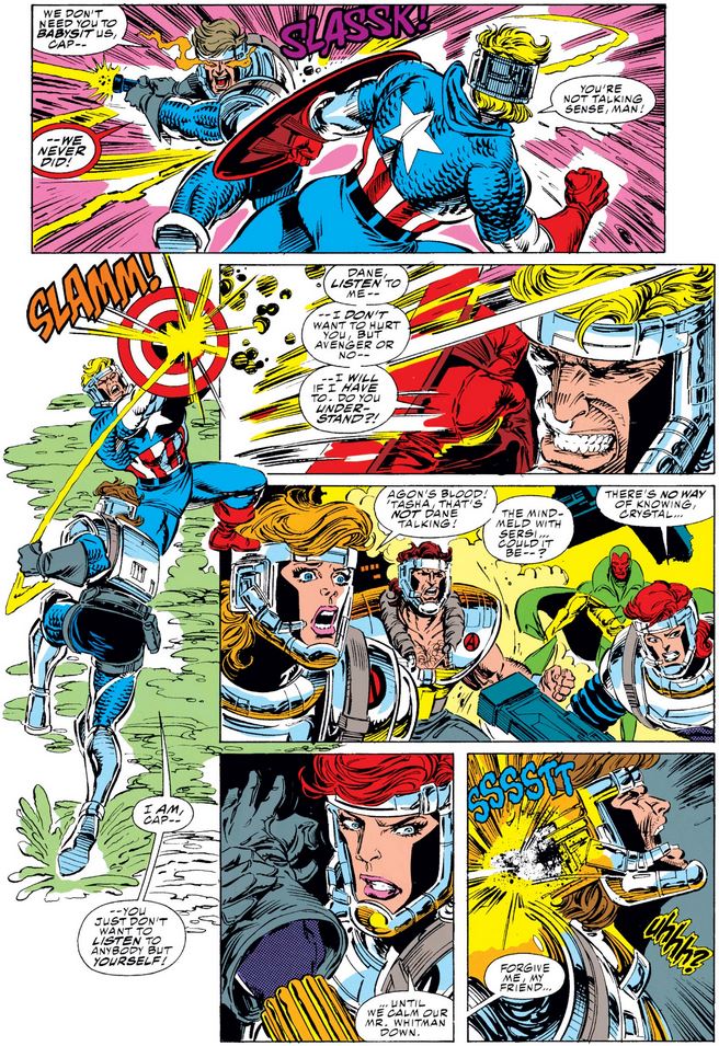 Cap doesn’t appear in issue #360 until the very end, too late to stop a Vision from another timeline—a member of the Gatherers, led by a fella by the name of Proctor, who claims to be Sersi’s husband—from attacking Sersi, who thinks she is going mad after killing a man in the last issue. (The Swordsman seen below, whom the Avengers were curious about way back in issue #344, is also from a different timeline and used to be with the Gatherers.)