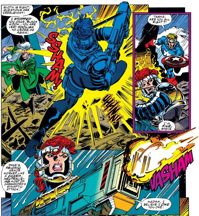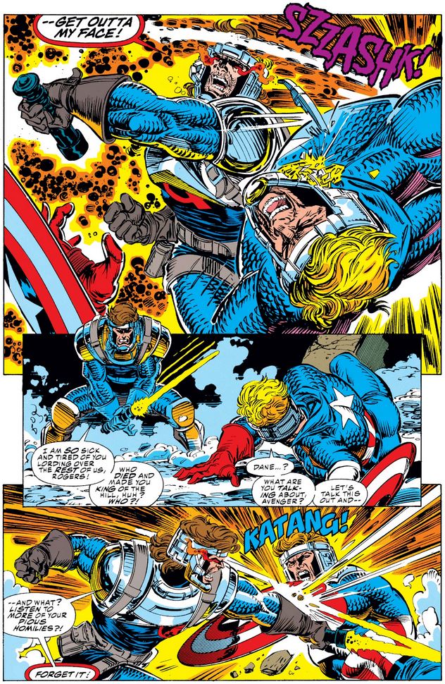 With these issues, Captain America returns to the Avengers for the first time since Operation: Galactic Storm ended, finding himself in the middle of a typical 90s Avengers story full of evil doppelgängers, evil space aliens, and evil jackets. (OK, maybe the jackets aren’t evil… but do we really know?) It’s an auspicious return for the classic Avenger, in which we see Cap easing his way back into the group dynamics, standing back while Black Widow leads the team and pitching in when needed.