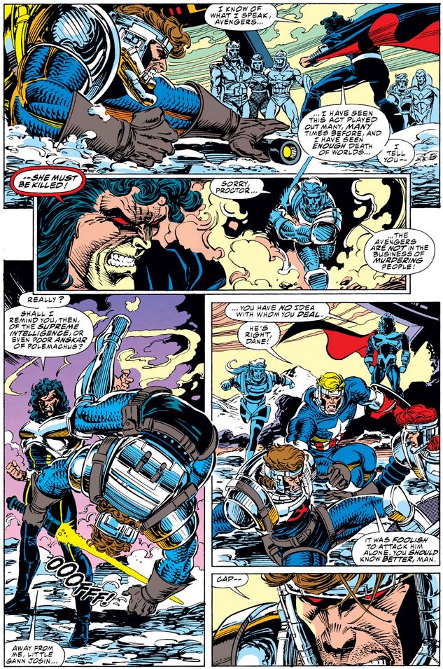 Eventually Proctor shows his face, sees the sign of the Gann Josin-ness in the Black Knight’s eyes, and proclaims himself Sersi’s one-and-only… and reminds us that you always hurt the ones you love. When Dane (of all people) claims that Avengers do not kill, Proctor shows he’s done the reading, and when Cap offers a word of criticism…