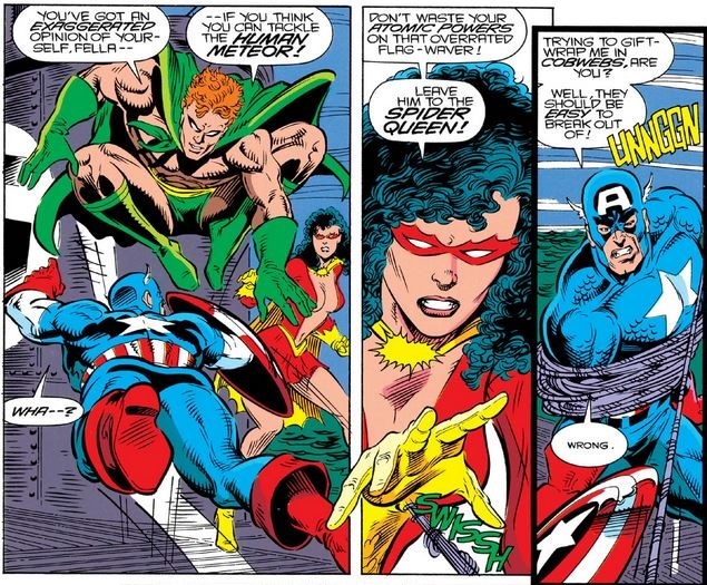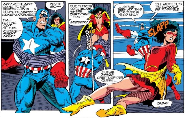 When he finally wriggles out of Spider Queen’s webbing (by exhaling, I guess), Cap is still careful to strike her lightly, whether out of a chivalrous reticence to hit a woman—a trait he still displays occasionally in the modern day—or the simple recognition that she has no super-powers and would therefore fall easily to a light SLAPP.