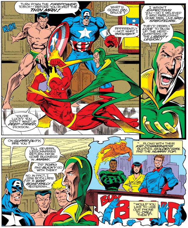 Invaders (vol. 2) #3, July 1993: Roy Thomas (writer), Dave Hoover (pencils), Brian Garvey and Ian Akin (inks), Paul Becton (colors), Pat Brosseau (letters). (More details at Marvel Database.)