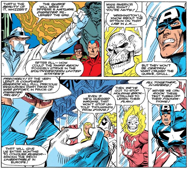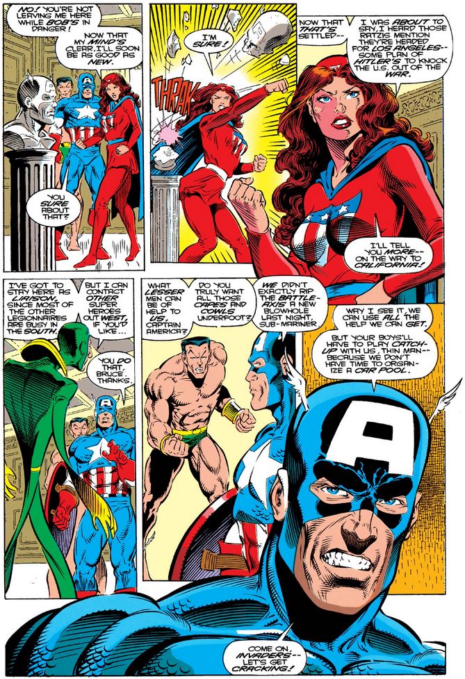 After encountering and narrowly escaping the Battle-Axis at the end of this issue, Miss America falls through the window of the Liberty Legion headquarters at the beginning of issue #2. After Cap catchers her, she tells him and the others that the Nazis captured the Whizzer (her fellow Liberty Legionnaire and Invader, as well as her boyfriend), as well as their evil plans having something to do with a “Project Mojave.”