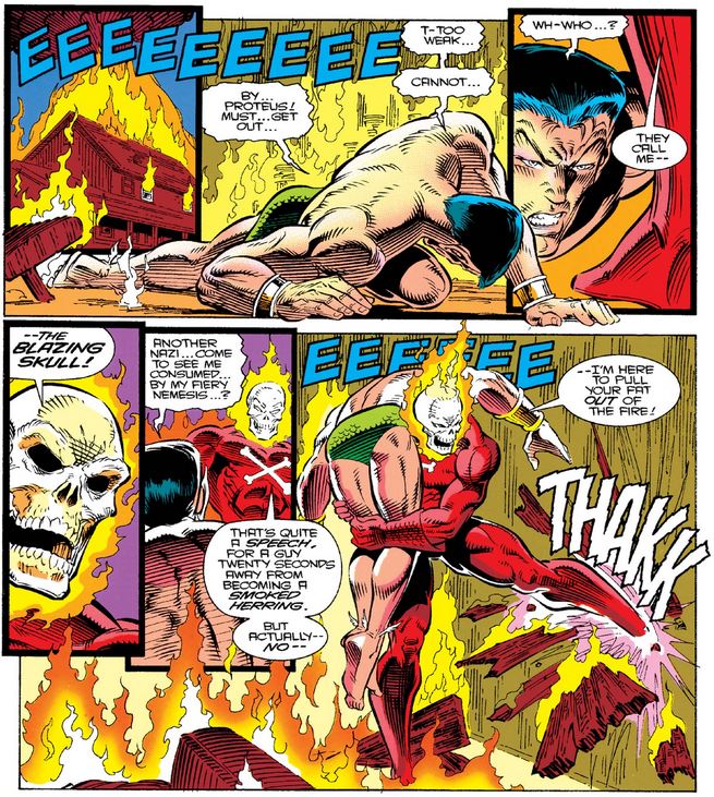 The team splits up, with Namor and the Torch looking for Dr. Johann Goldstein, the scientist they rescued in Invaders #11-13 who is now involved with Project Mojave, but instead they find his brother Jacob, otherwise known as the Golem, apparently now working with (or for) the Battle-Axis. After defeating them both, Jacob leaves with the Torch, leaving Namor to die in a burning building—until he is rescued by Ghost Rider the Blazing Skull, in his first appearance since 1942 (not counting Rick Jones’ “recreation” of him and other Golden Age heroes in Avengers #97).