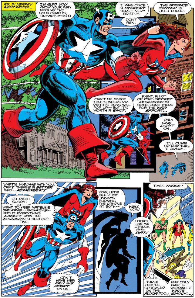 Meanwhile, Cap and Miss America visit UCLA to look into the Mojave Project, with Cap trying to distract his fellow hero from thinking about the captured Whizzer.