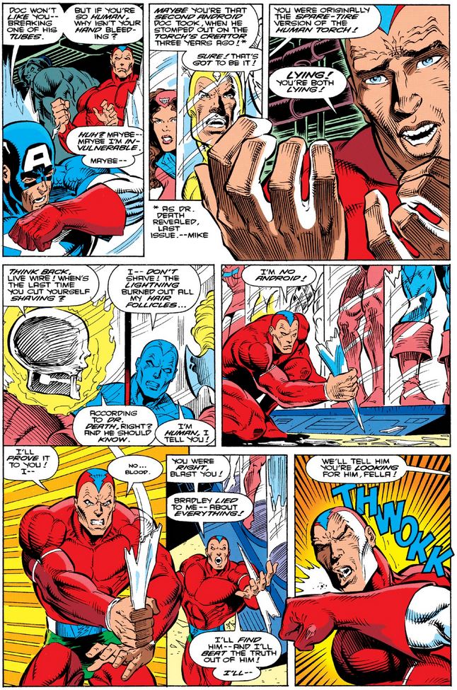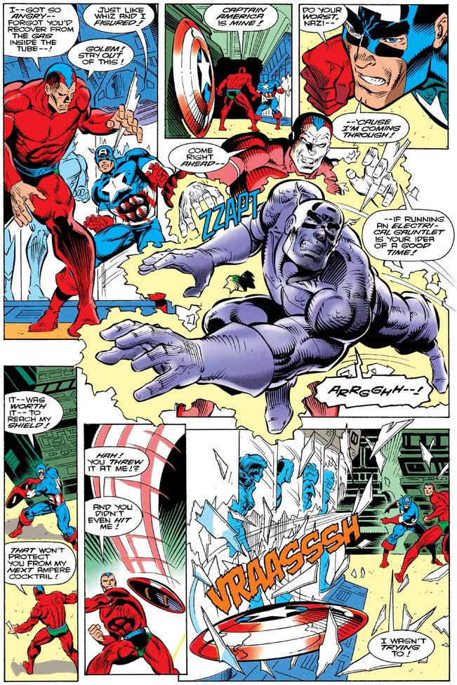 After a short skirmish between the Human Torch and Volton, the rest of the Battle-Axis leaves to enact their plans, leaving Volton and the Golem behind to watch the Invaders. After Volton brags that the Torch is now frozen and poses no threat, Cap exercises some logic to goad the turncoat hero.