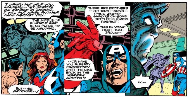 …after which they easily subdue Volton. The Golem has a partial change of heart, but Cap still calls him out, asking him to remember what it was like in Nazi-occupied Poland. (The Golem does eventually agree to join the heroes, asking God for forgiveness should his brother suffer for his choice.)