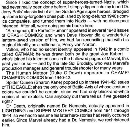 If these folks look familiar, congratulations: As Thomas explains in his column at the end of issue #4 (included at the end of this post), these were all forgotten Golden Age heroes who were published by other companies but were now in the public domain and so could be “turned” to Nazis (so Timely’s own heroes didn’t have to be soiled in this fashion!).
