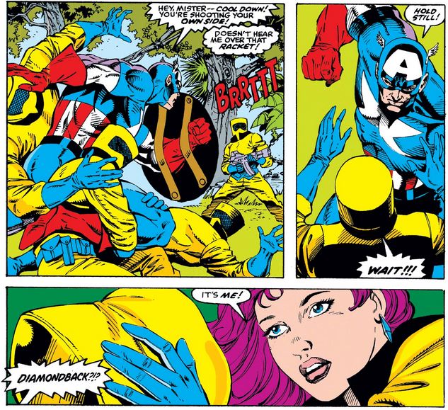 Unbeknownst to him, Diamondback has subdued an AIM agent, taken his beekeeper outfit, and started shooting at the others, giving Cap an opening to fight back as well.
