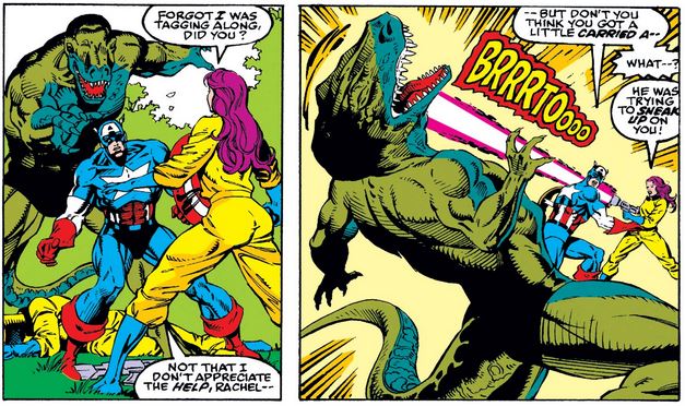 Issue #416 picks up where the last left off, with Cap, Zabu, the Dino-Men, and AIM agents in a fine mess, with Cap thinking first about the sabretooth, as is his wont.