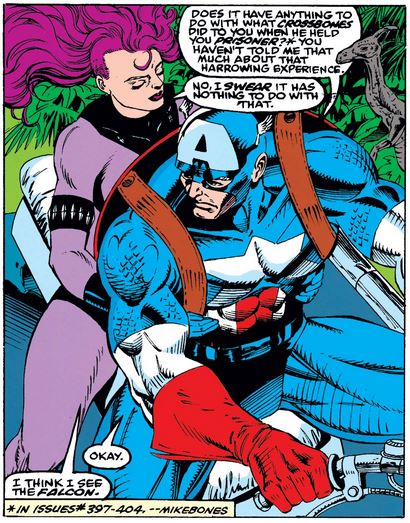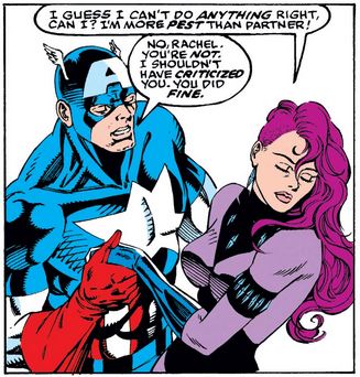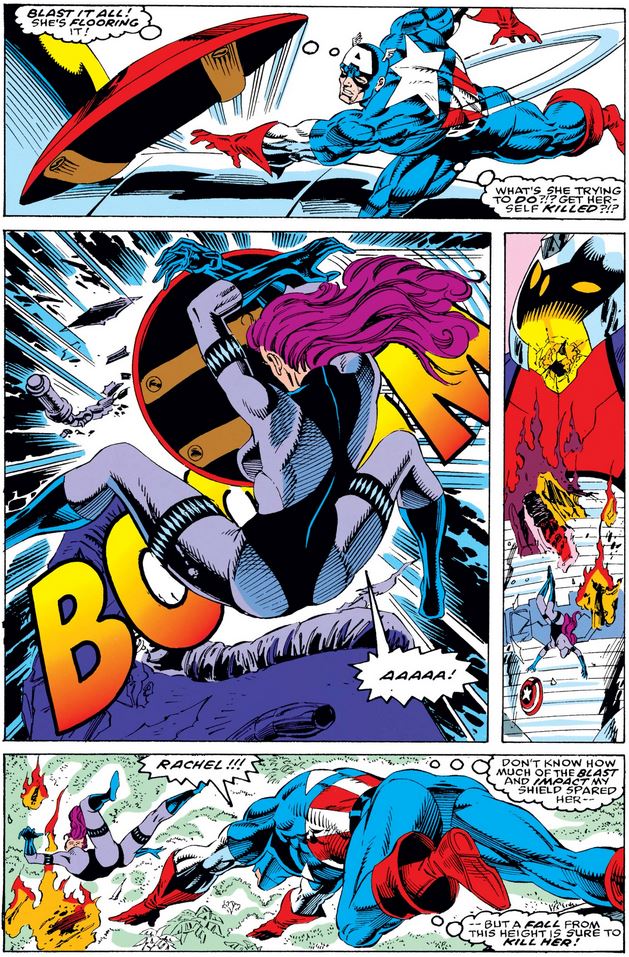 As they head toward the skycycle, Rachel thinks she sees her old foe Snapdragon, whom she secretly killed in issue #413, and fires at her, raising Cap’s hackles yet again before he realizes something’s wrong with her—because she told him something’s wrong with her.