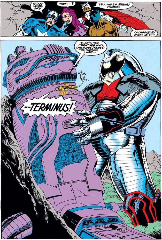 When Ka-Zar tells him that their vibranium is very unstable, Cap remembers the story of David and Golaith, and starts throwing rocks at Terminus, counting on it containing the miracle metal. Eventually it trembles and collapses; and what about T’Challa, who was inside of it?