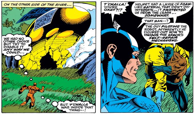 Cap also gets a chance to use his infamous judo skills, highlighted in his early Tales of Suspense stories. (In case you’re wondering, T’Challa is not miscolored below: He lost his shirt escaping from a tar pit earlier in the issue.)