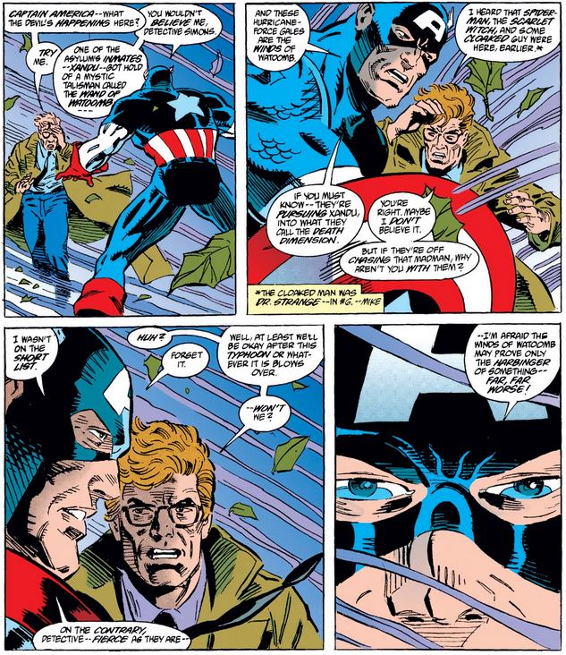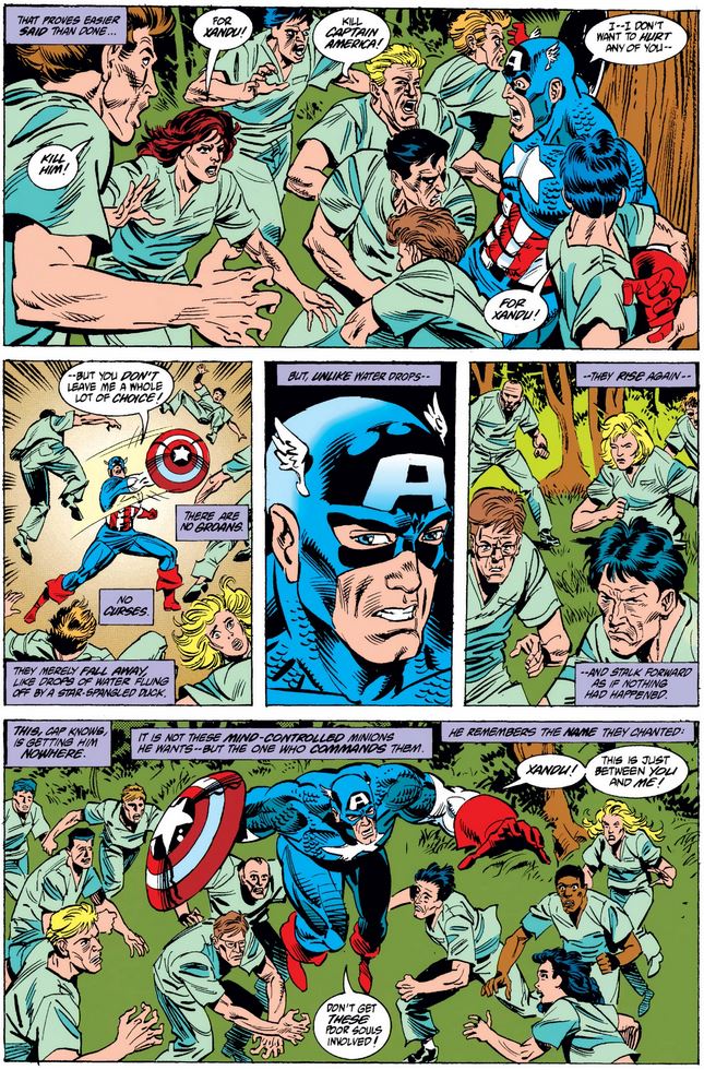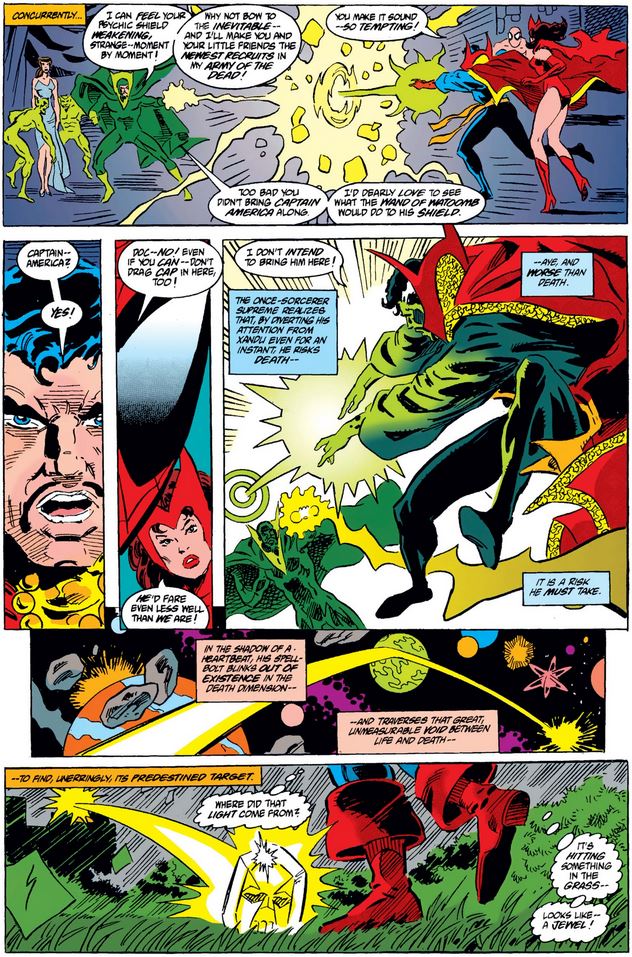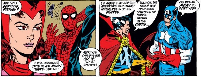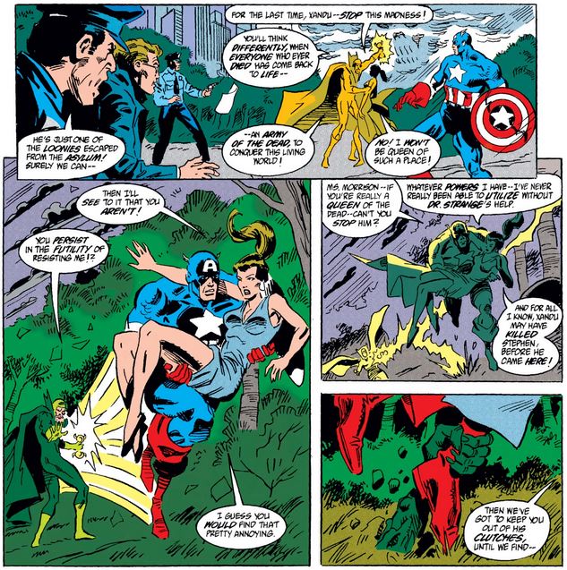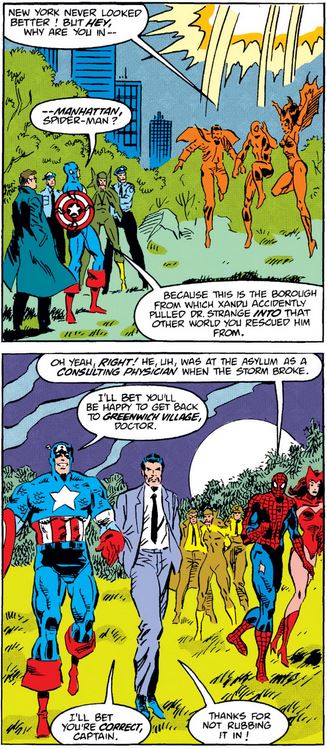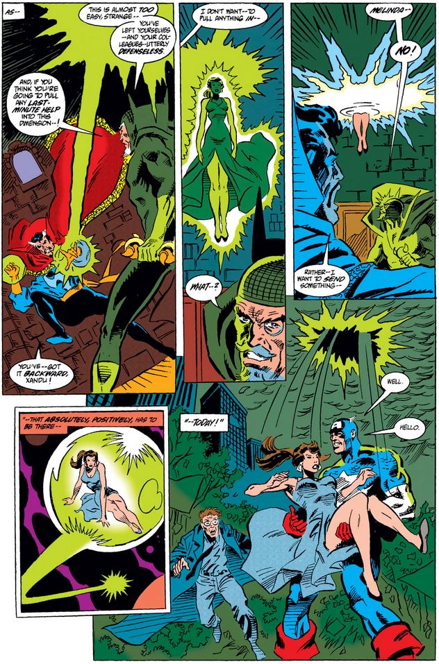 Again, I have no idea what the exchange above is in reference too—is Cap pointing out that he helped defeat Xandu, even though Strange made him stay at home? I figured that was always the plan. (Oh well, whatever.)