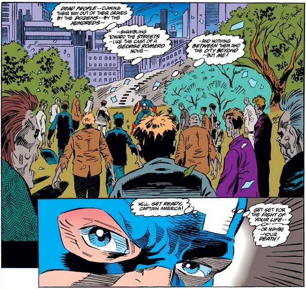 In issue #8, Cap helpfully clarifies that the zombies are not alive but the people they endanger are.