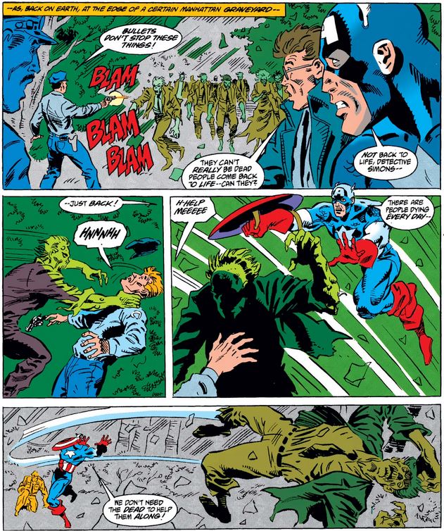 Most of the rest of this issue takes place in the Death Dimension, but we return to NYC near the end, at which point we introduce zombies to the cast…