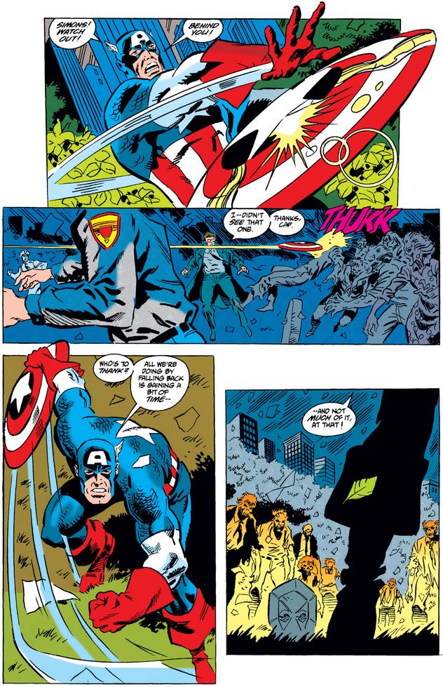 ALSO THESE MONTHS: Captain America #418-419 and Silver Sable and the Wild Pack #15 (August-September 1993), Invaders #4 (August 1993), Amazing Spider-Man #380, Spectacular Spider-Man #203, Spider-Man #37, and Web of Spider-Man #103 (August 1993), Infinity Crusade #3-5 (August-October 1993), Captain America #420, Nomad #18, and Thor Corps #1-2 (September-October 1993), and Avengers: The Terminatrix Objective #1-2 (September-October 1993)