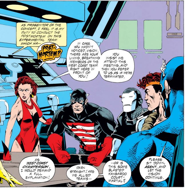 Vision starts by citing the haphazard nature of the West Coast team’s membership, with several prominent members (Hawkeye and Wonder Man) missing, and their headquarters being repeatedly subject to attacks. Wanda argues that this is a result of their team being underfunded compared to the “premiere” team in NYC, an argument that Cap dismisses—unfairly, says this public university professor—citing ancient history when the team consisted of just four members and a dream. Then he turns to War Machine and USAgent specifically, criticizing their performance in the recent Bloodties event, becoming very sarcastic with Walker in particular. (I mean, sure, it’s Walker, but still—not a good look for Cap when he’s trying to make a point.)