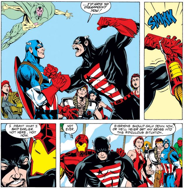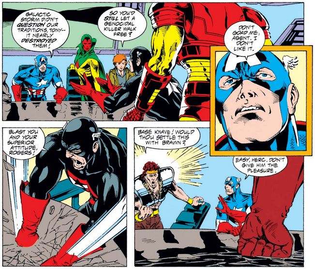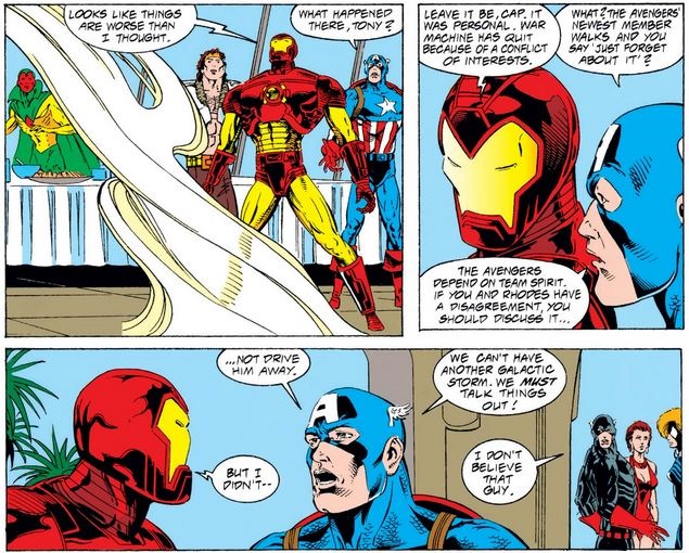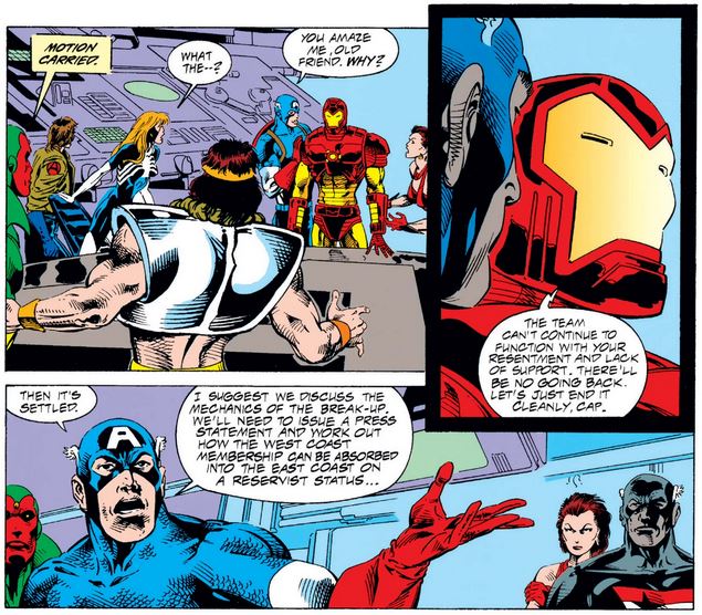 Tony makes the point that Operation: Galactic Storm signaled a split in the team and demanding an update in their thinking. (And he’s much less contrite about those events than he was in Captain America #401!)