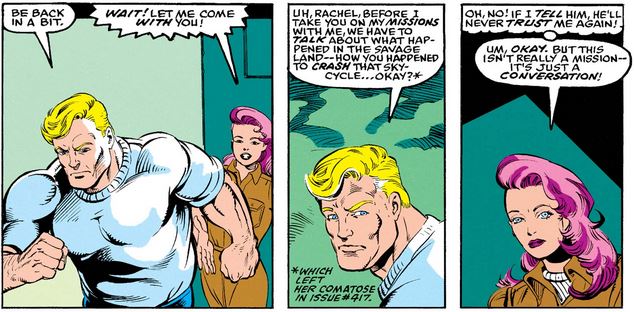 Naturally, Rachel wants to come along, but first Cap wants to know more about her erratic behavior on recent missions (due to her guilt about murdering Snapdragon in issue #413, which she hasn’t told him about yet).