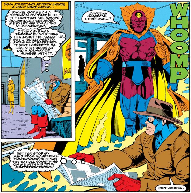 Rachel (the voice on the other “end” of Cap’s Avengers card) takes him to where Sidewinder was trying to steal money from drug dealers, and they arrive to find the villain transporting repeatedly (which he does when injured).