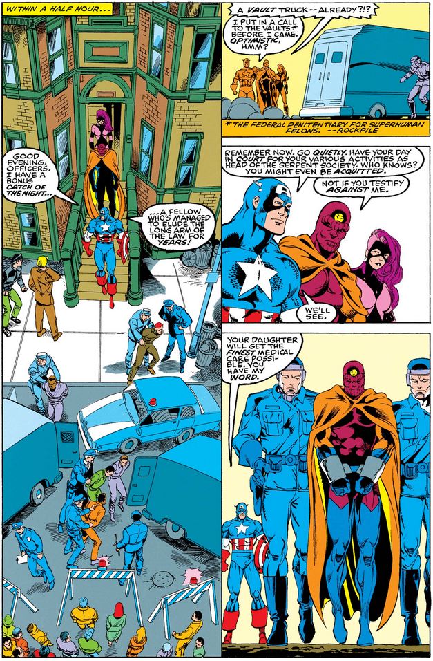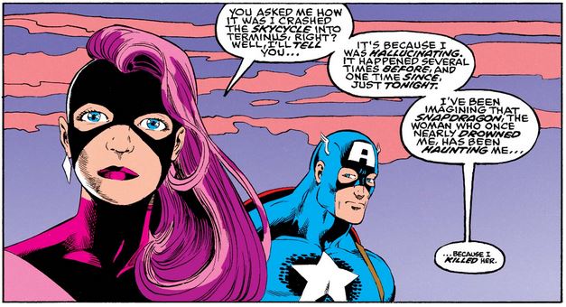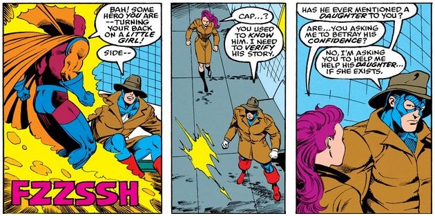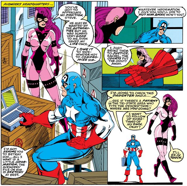 Sidewinder uses his daughter’s plight to make Cap feel guilty before transporting away, after which Cap asks Rachel to verify his story, ironically using a similar ploy to try to get her to reveal confidential secrets about her former friend.