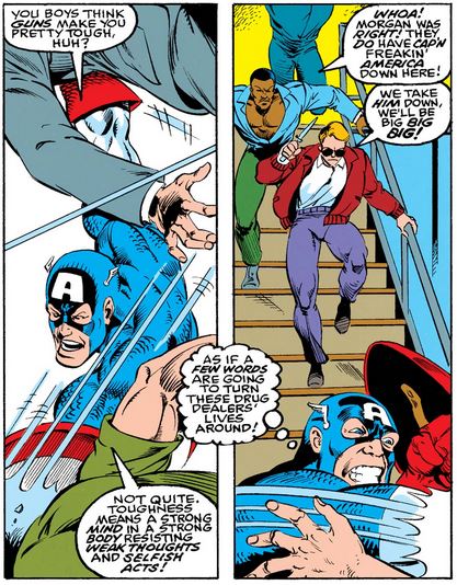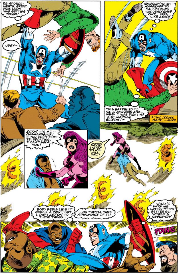 As more thugs arrive, Cap starts to feel the sudden exhaustion he first experienced in issue #422, and is mindful not to let it show to his opponents.
