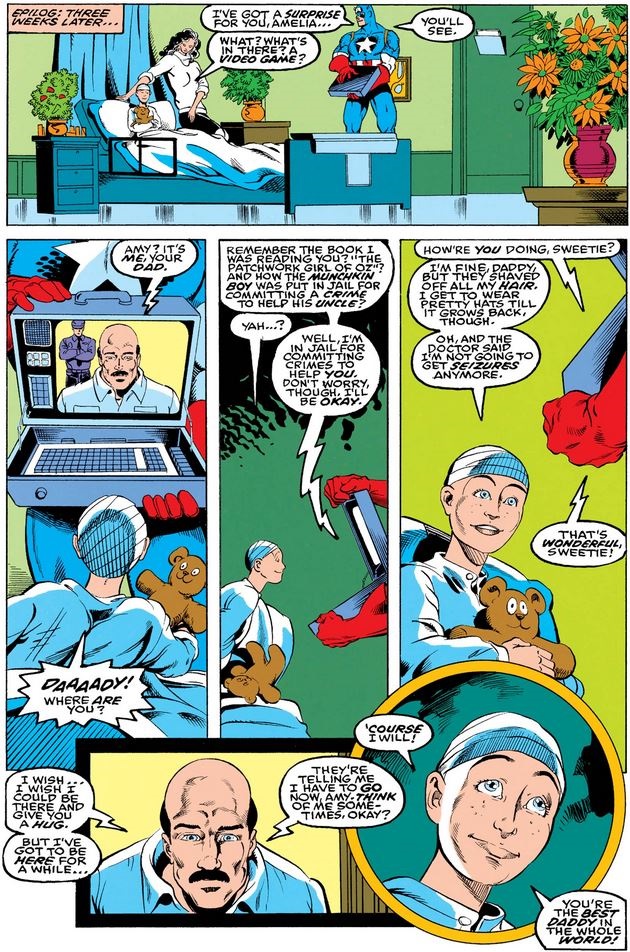 Our story ends of a heartwarming note as Cap visits Amelia’s hospital room weeks later—out of disguise, even—so she can video-chat with her dad, to whom she is just as forgiving as Cap was to Rachel.
