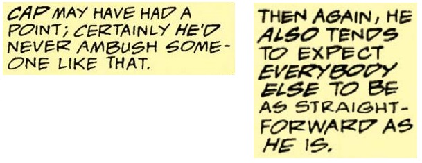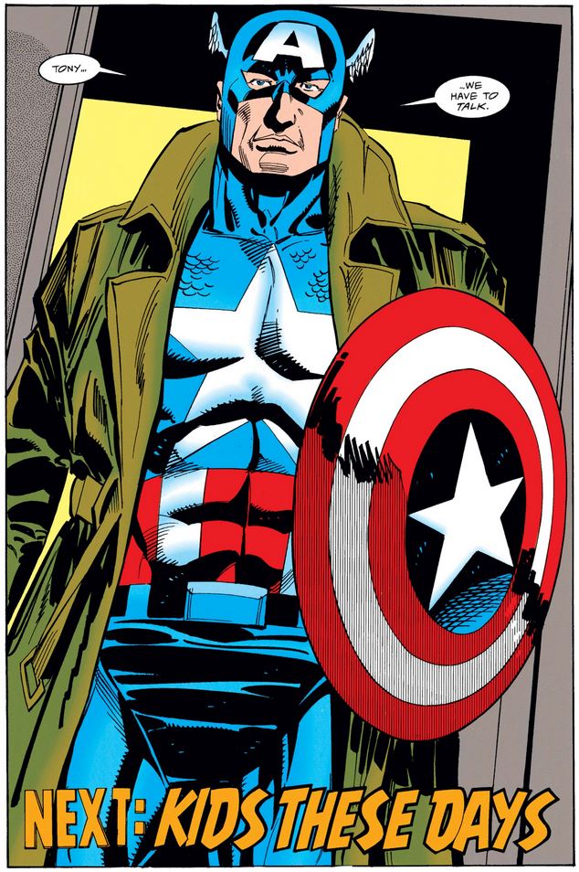 But this gives Cap an opportunity to mention his recent health problems, confirmed in Captain America #425, which he takes in stride and with admirable perspective born from his well-known humility. He also has a chance to ask Tony for some advice