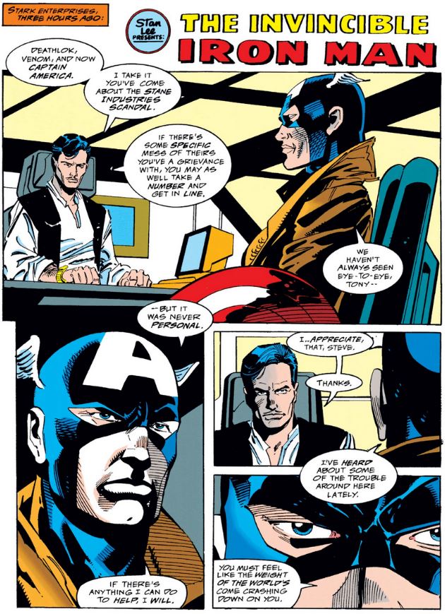 Seriously, though, Cap appears here as a friend, knowing all too well what it feels like to have everyone against you—but Tony Stark and Stark Enterprises do not enjoy the benefit of doubt with the public that the Sentinel Liberty does.