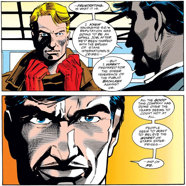 These three issues of Iron Man are part of the “Crash & Burn” storyline, in which Tony Stark has to defend himself and Stark Enterprises against allegations of illegal behavior due to Stane International, which Stark absorbed as part of a bad deal with Justin Hammer (in issue #283). Over six issues, Tony faces a number of challengers seeking redress for the activity, starting with Deathlok in issue #301, then Venom, the New Warriors, and Thunderstrike in the issues covered here. But of course, our focus will be on Captain America, who stops by to lend an ear when Tony needs it. No epic Captain America-Iron Man throwdown here, dear readers—just two friends having a chat, which nonetheless gets heavy at times.