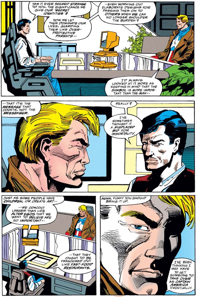 This leads Tony and Cap in deeper territory, beginning with an ironic musing about their secret identities, which both later abandon, but is nonetheless a major point of contention during the fight over registration over a decade later. However, here they think of their superhero identities as separating them for their roles so others can take over, which Cap thinks of in terms of continuing the heroic mission, while Tony considers it in more self-interested terms of establishing a personal legacy (while at the same time acknowledging the absurdity of the idea).