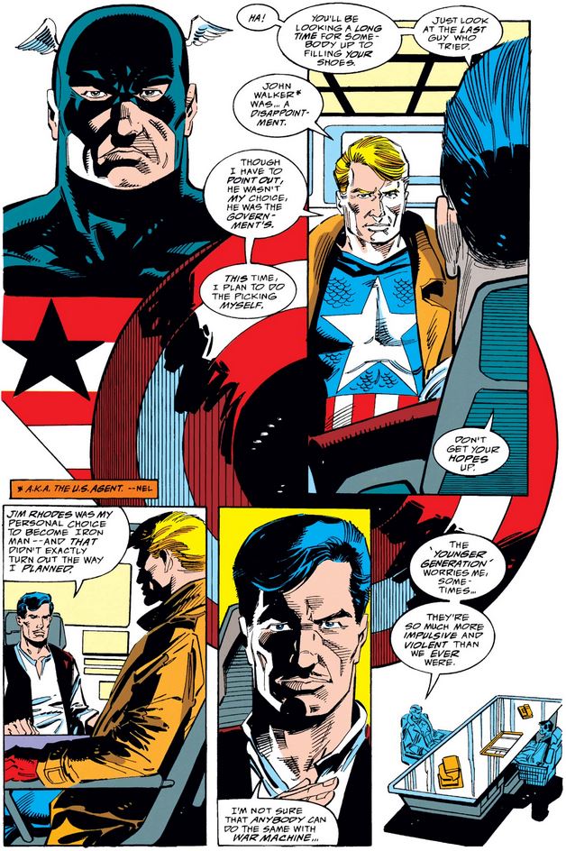 The discussion naturally leads to their successors, with Cap regretting the Commission’s choice of John Walker and committing to choosing his own (which he finally does twenty years later). Tony points out that doing so doesn’t guarantee success either, referencing his contentious relationship with Jim Rhodes since he took over as Iron Man for a time, starting in issue #170.