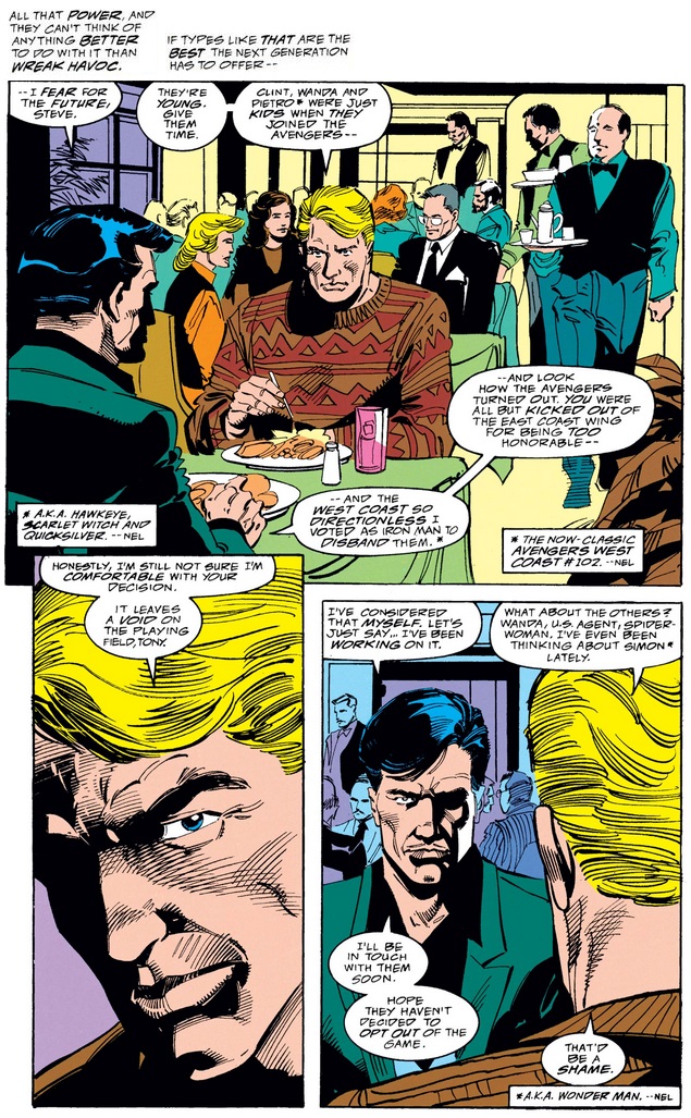 When the focus returns to the two Old Warriors, Tony cuts off their conversation but offers to buy Cap dinner, which Cap takes him up on in issue #304. Before we join their meal, though, Tony again recalls his battle with the New Warriors (who were joined by Thunderstrike), inspiring more dour comments about the youths to Captain Sweater—who defends them this time around, reviewing some Avengers history in the process. (They would have similar qualms about the Young Avengers many years later, which they would later regret after this new class also proved themselves worthy.) This leads to the current state of the Avengers, with the main team becoming more extreme and the West Coast team having disbanded on Tony’s orders.
