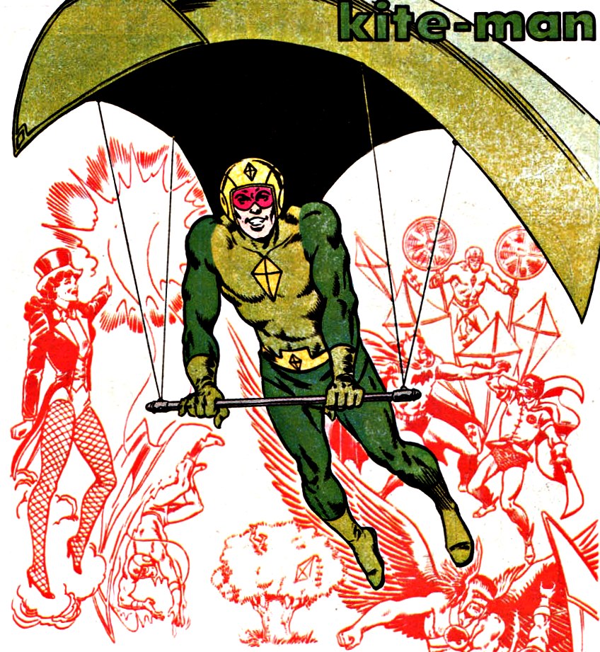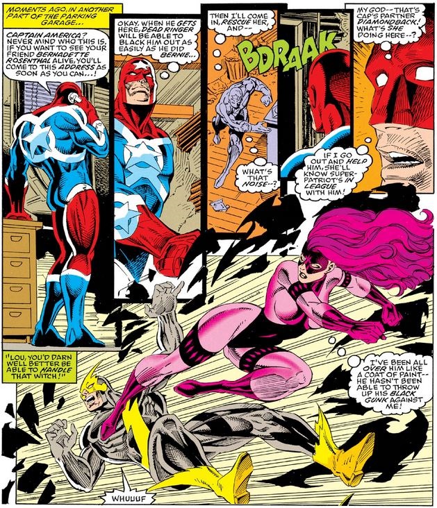 Below we see Super-Patriot, disguised as Cap, and Dead Ringer, who chooses to impersonate Kite Man—sorry, I meant the Night Flyer, a deep cut excavated by writer and Marvel historian Mark Gruenwald (and originally due to the King himself, Jack Kirby).