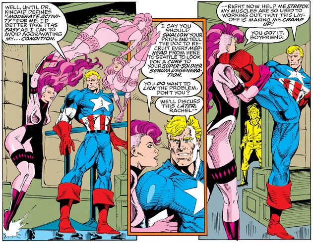 After they remind us about Cap’s condition and Rachel reiterates his refusal (in the last issue) to seek help for it, she serves as his physical therapist, keeping his old muscles limber. (Ouch again!)