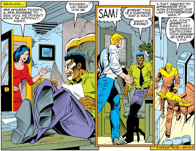 While those two find themselves battling several members of the Mutant Liberation Front, Steve touches base with Sam Wilson to mend some fences after they disagreed about Steve becoming involved with Diamondback in issue #418…