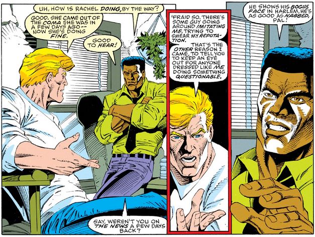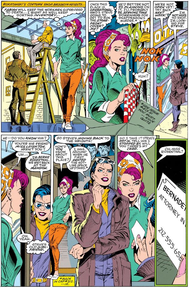 Bernie suggests that a plea of temporary insanity may be available and promises to look into the criminal law of the Caribbean island where Rachel killed Snapdragon, when they are interrupted by Bernie’s ex-husband Sammy, who first appeared in issue #275 as a violent counter-protestor at a neo-Nazi rally. Sammy uses equally forceful conviction to express his desire to get back together with Bernie, which gives Rachel an opportunity to return a favor. (It is also strongly implied later that Sammy is the new Super-Patriot, but he is actually the Red Herring.) Meanwhile, Cap reaches out to Quicksilver, which he resents silently.
