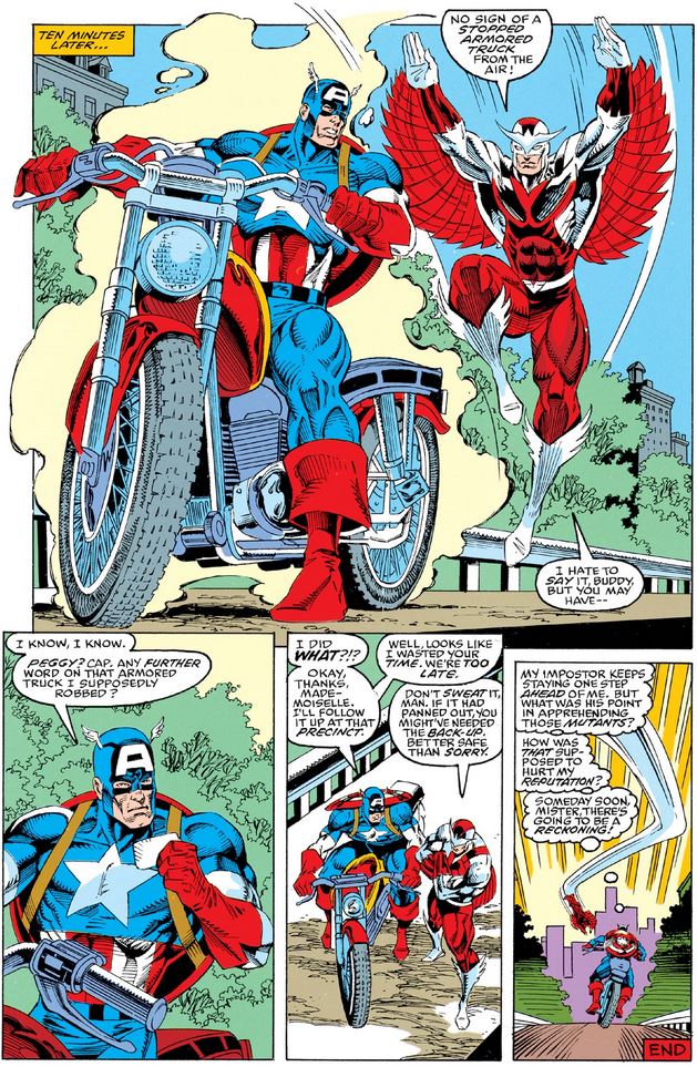 We’ll return to them later… for now, the dynamic duo of Captain America and the Falcon is back, investigating a new sighting of Fake-Cap (who defeated his own purpose by helping to bring in the Mutant Liberation Front members, confusing Cap no end).