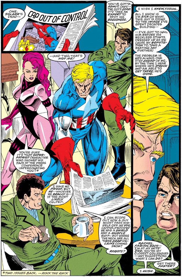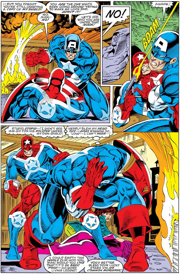 But before Cap can go all Scooby gang on him, Super-Patriot fires a bullet past Cap’s ear, stunning him…