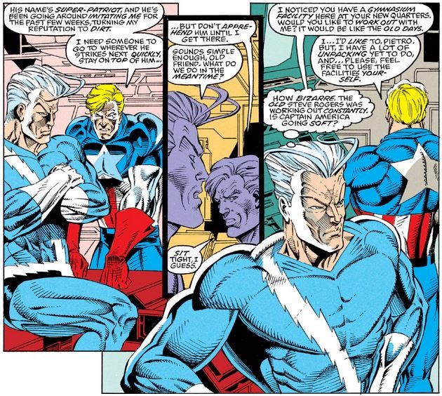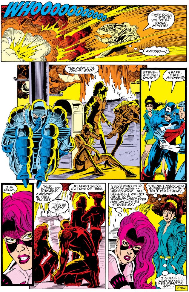 Quicksilver shows up first and gets tangled up with “Blue Streak,” another dead villain. After Super-Patriot takes Rachel out with his shield and Bernie recognizes his voice (wink wink), Cap finally shows up to expend a little energy as possible in taking out his foe.