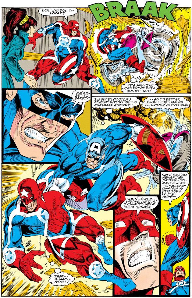 When one of Super-Patriot’s bullets brings down a wooden beam, Cap hesitates for a moment, thinking of how much rescuing his foe would tax his already depleted system, before realizing he has no choice when a life is at stake.