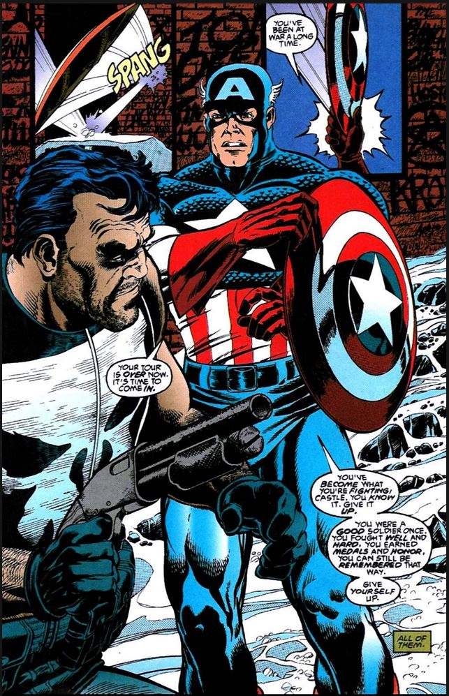 …but Cap shows that shield-to-face is the way to go, after which he reminds Frank that even though they’re both fighting wars, so to speak, good soldiers don’t betray their principles to do it.