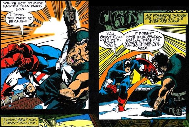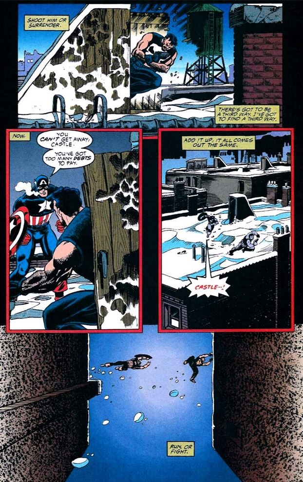 While he runs, Frank considers his options and finds them lacking, but when Cap catches up surprisingly quickly, he frames his choice differently…