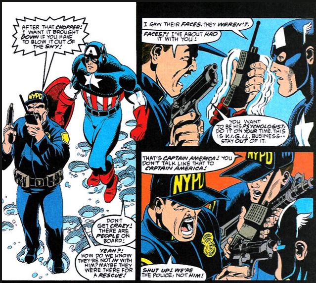After Frank escapes on the TV news chopper, Cap turns his attention to the V.I.G.I.L. leader who wants to take extraordinary measures to bring Frank down (literally), and the exchange between the two officers reminds us that not all police in the Marvel Universe appreciate the presence of superheroes. (Somewhere, Batman nods and sighs.)