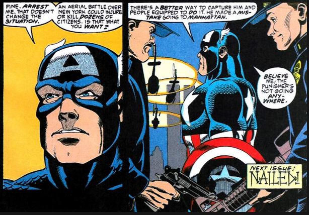 When we come into the story, V.I.G.I.L., a federal anti-vigilante task force working with the New York Police Department, have the Punisher trapped in an apartment building in a run-down area of Brooklyn, eager to apprehend him after he was caught on tape killing a police officer in issue #64. At the end of issue #65, the head of V.I.G.I.L. tells the other officers, “don’t bother bringing the Punisher in alive,” to which a voice from off panel responds, “Wrong!” Cap appears on the final page to defend Frank’s basic stance on crime while criticizing his methods, insisting on bringing him in himself rather than endangering the lives of civilians or police.