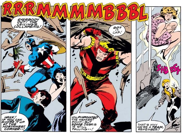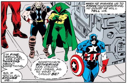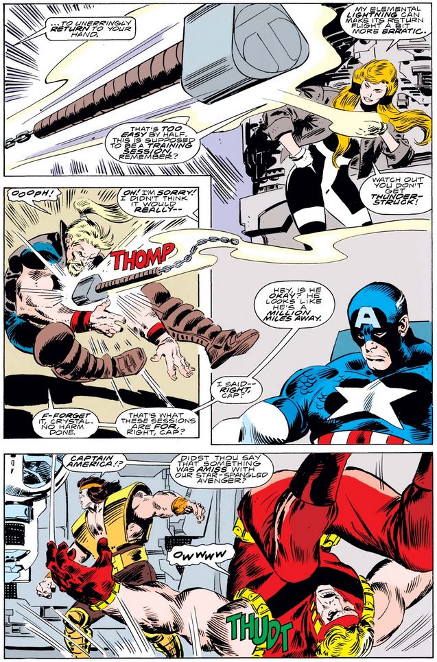The story opens with the Avengers engaging in a lighthearted training session, which Cap would normally enjoy, but definitely not this day—and Hercules is very concerned. (Also, don’t tell me you didn’t hear the song after Crystal’s final word balloon in the first panel.)