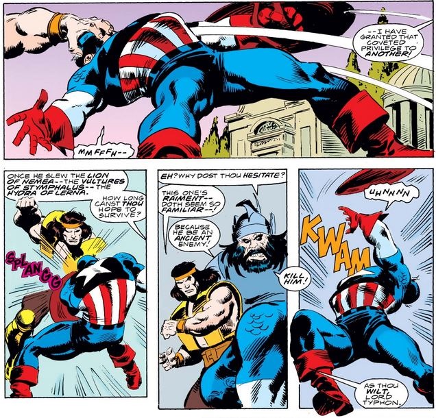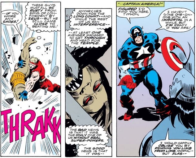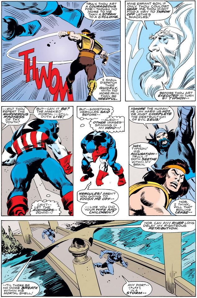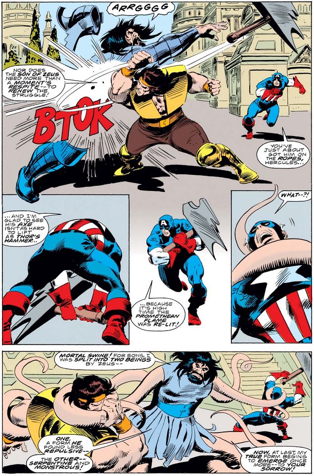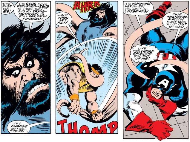 It is not Typhon whom Cap must fight, however, but his fellow Avenger Hercules, brainwashed by Typhon to forget his past and join him in his ongoing battle with Zeus (and the Avengers).